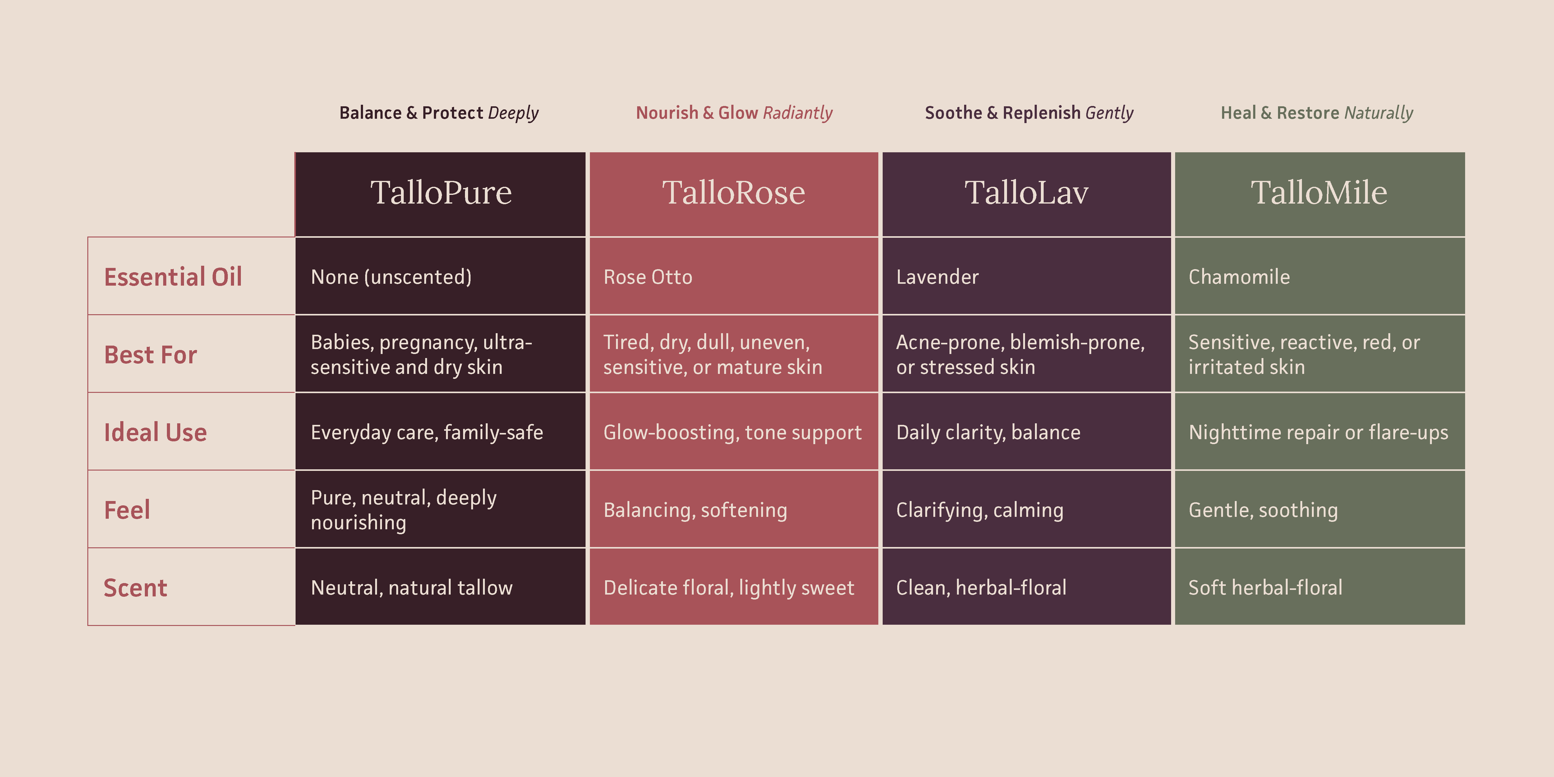 Whipped tallow is aerated to create a light, fluffy texture that spreads easily and absorbs quickly. Solid tallow is denser and richer, offering a more concentrated feel and slower melt. Both are equally nourishing — it simply comes down to how you prefer your balm to feel on your skin.