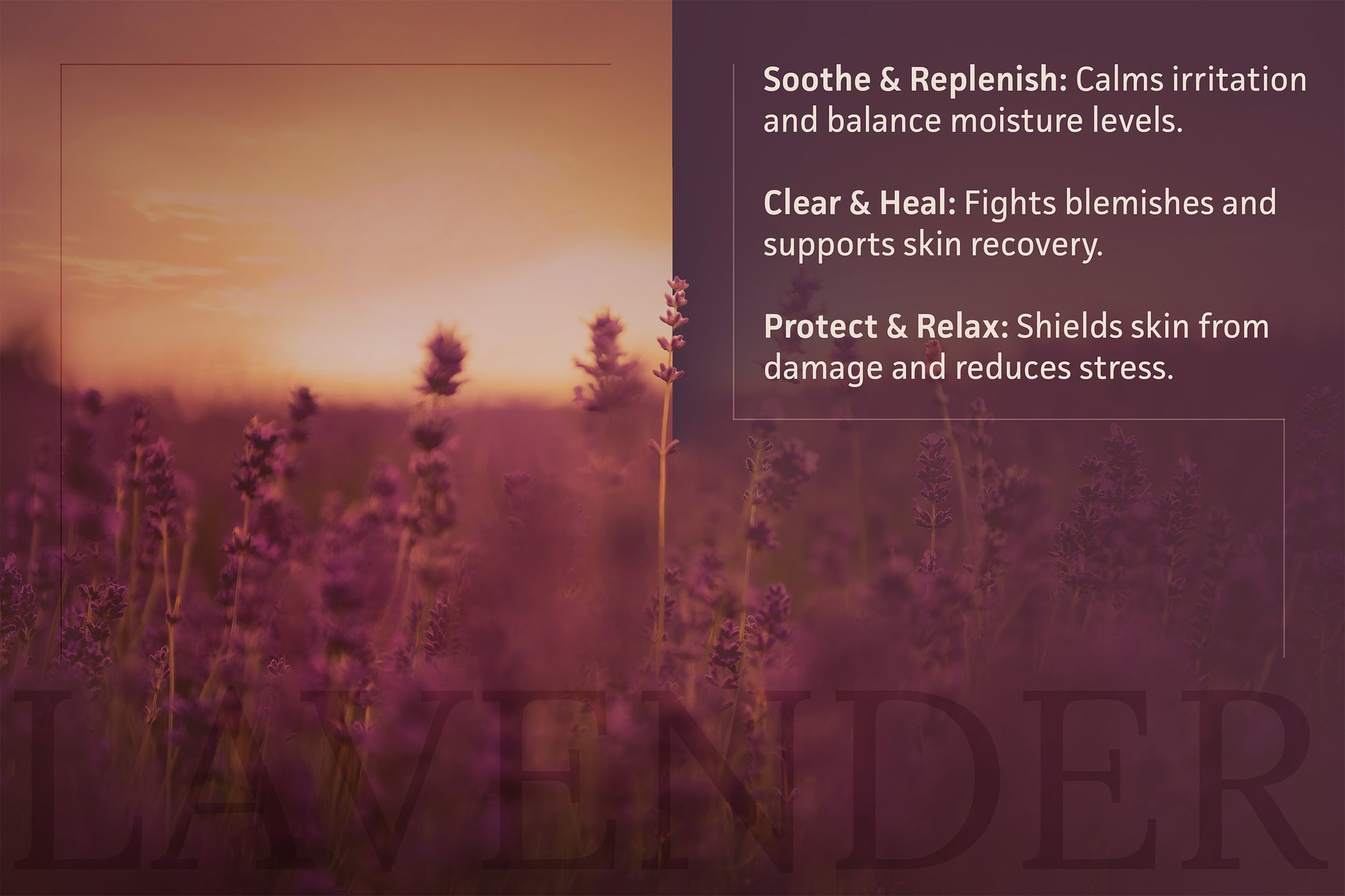 Relieves irritation, blemishes, redness, and inflammation while calming stressed or blemish-prone skin. Lavender’s naturally soothing touch supports balance and comfort with every application — so your skin feels clearer, softer, and more at ease.